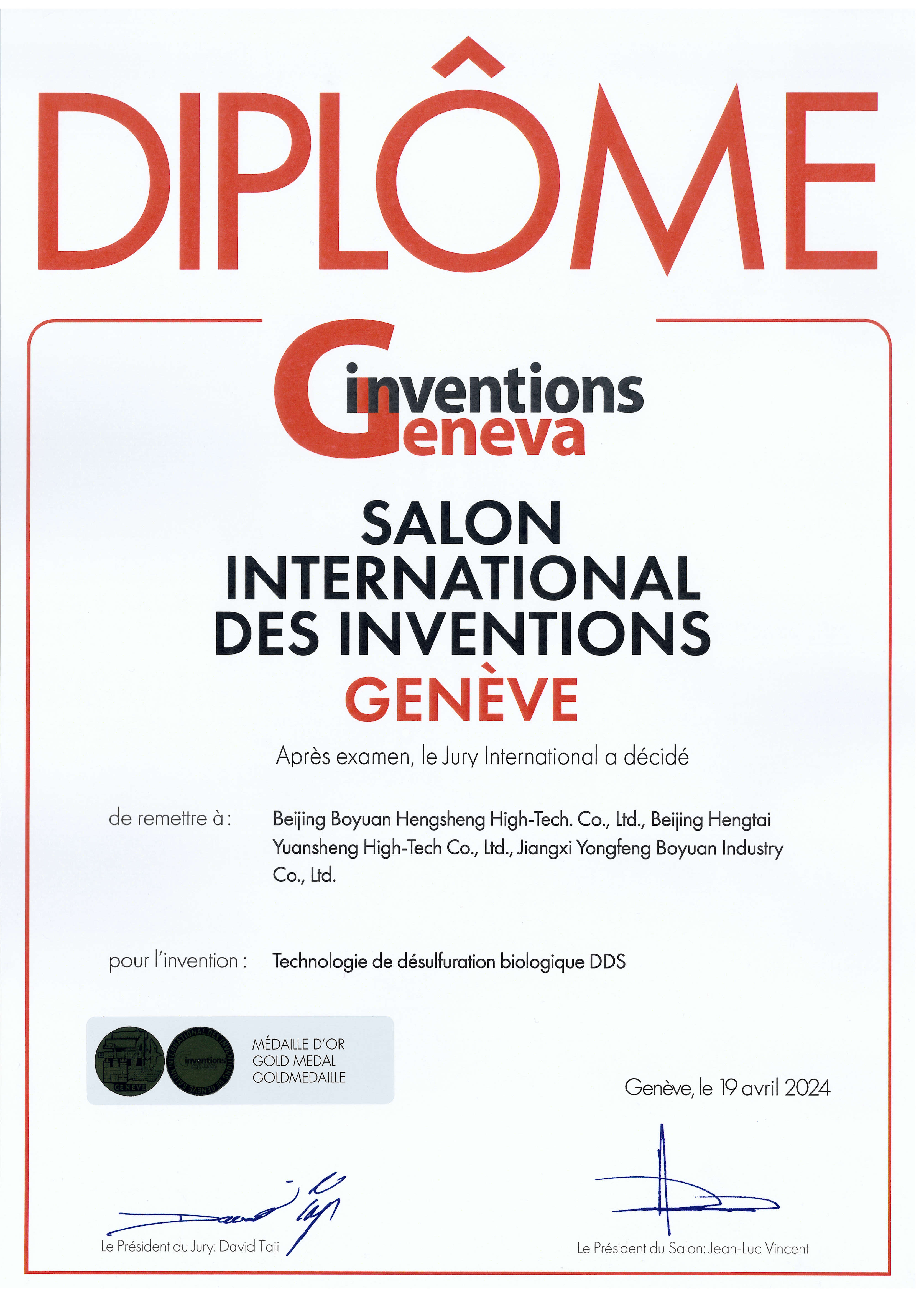 | 北京博源恒升高科技有限公司以“DDS生物脱硫技术”参加了2024年4月在瑞士日内瓦举行的第49届日内瓦国际发明展,并获得了金奖。 | |
