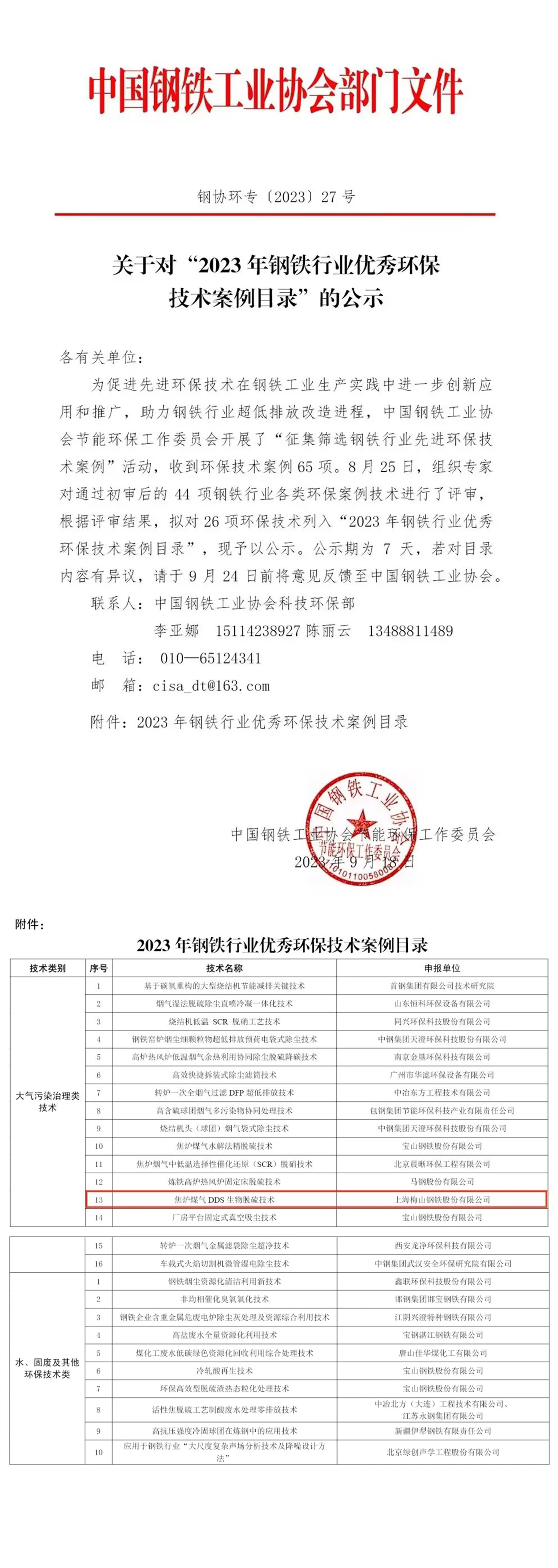 DDS生物脱硫技术入选“2023年钢铁行业优秀环保技术案例目录”