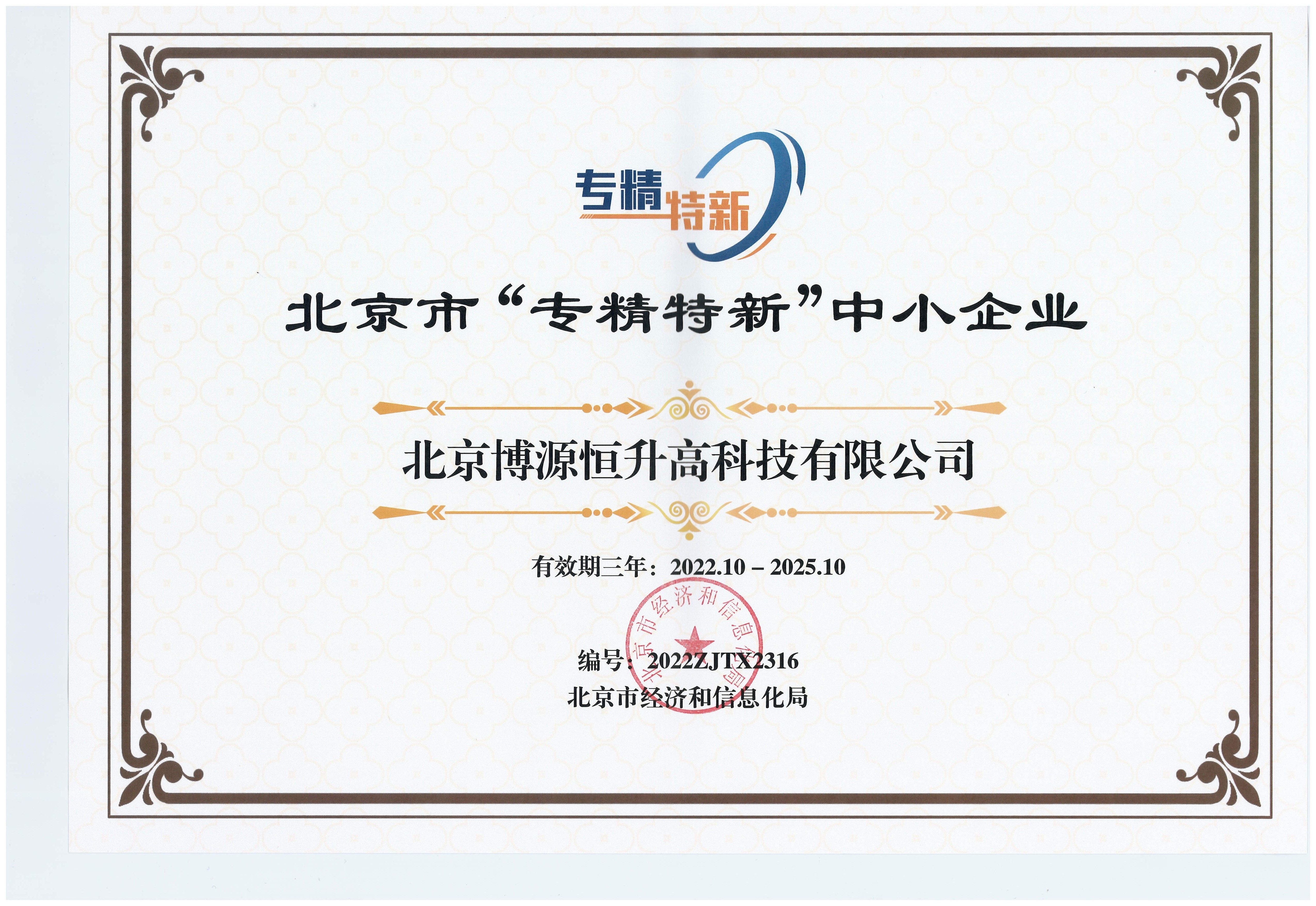 北京博源恒升高科技有限公司获得北京市“专精特新”中小企业证书